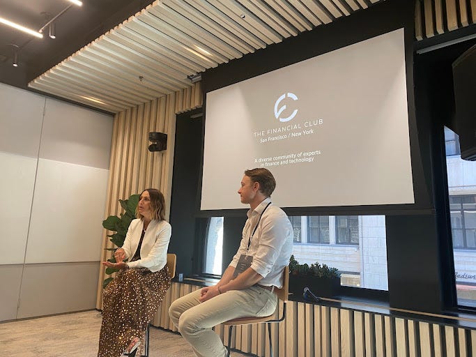 To kick off the day, I hiked over to Mastercard’s midtown Tech Hub on 5th Ave where the Financial Club hosted its monthly breakfast, with this month’s edition featuring a fantastic payments panel of Stephany Kirkpatrick, founder and CEO of Orum, and Bradley Riss, President of Meridian. After some light networking and breakfast, some of the topics that were hit on: