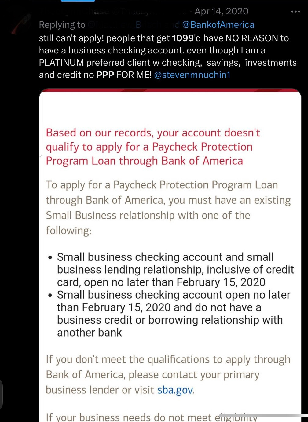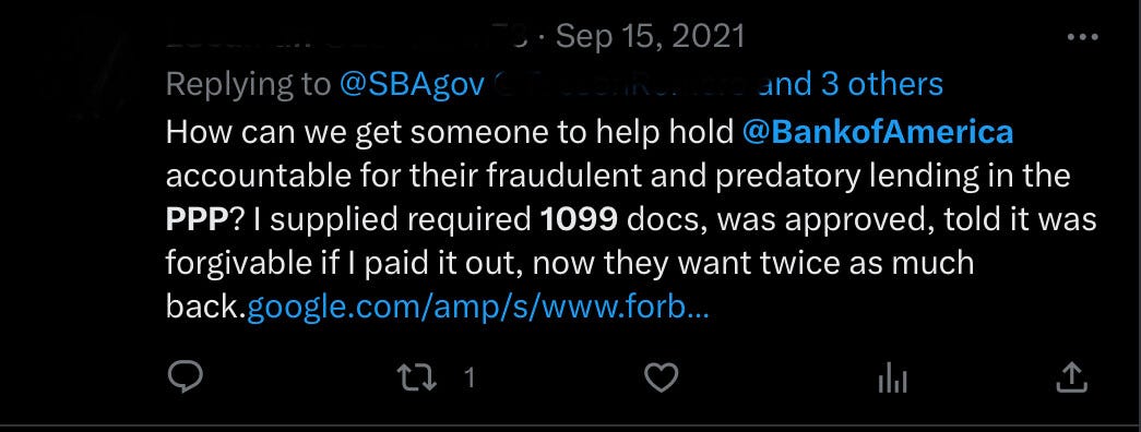 Bank of America, however, did not seem to get the message (and seems to stand alone, uniquely as such - more on that later). They appear to have deliberately instructed their PPP borrowers/applicants to include 1099 workers/independent contractors in their employee counts, thus increasing the amount that the businesses thought they could not only get loaned but ultimately forgiven. We have found various examples of where it turned out not only were businesses getting hit up by BOA to pay back loans they thought would be forgiven, but 1099 workers were being denied loans and being directed to seek relief from their employers from the very outset - here’s a few tweets speaking to the matter from upset business owners/independent contractors:
