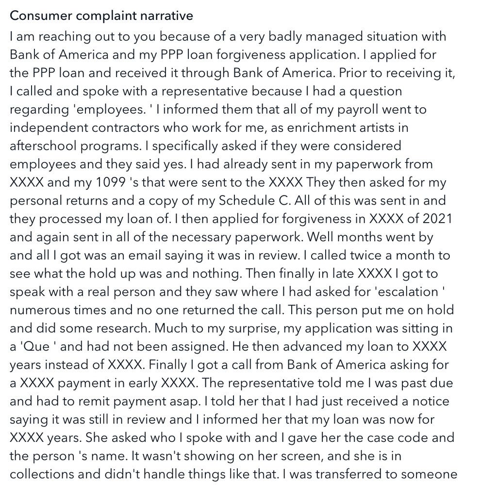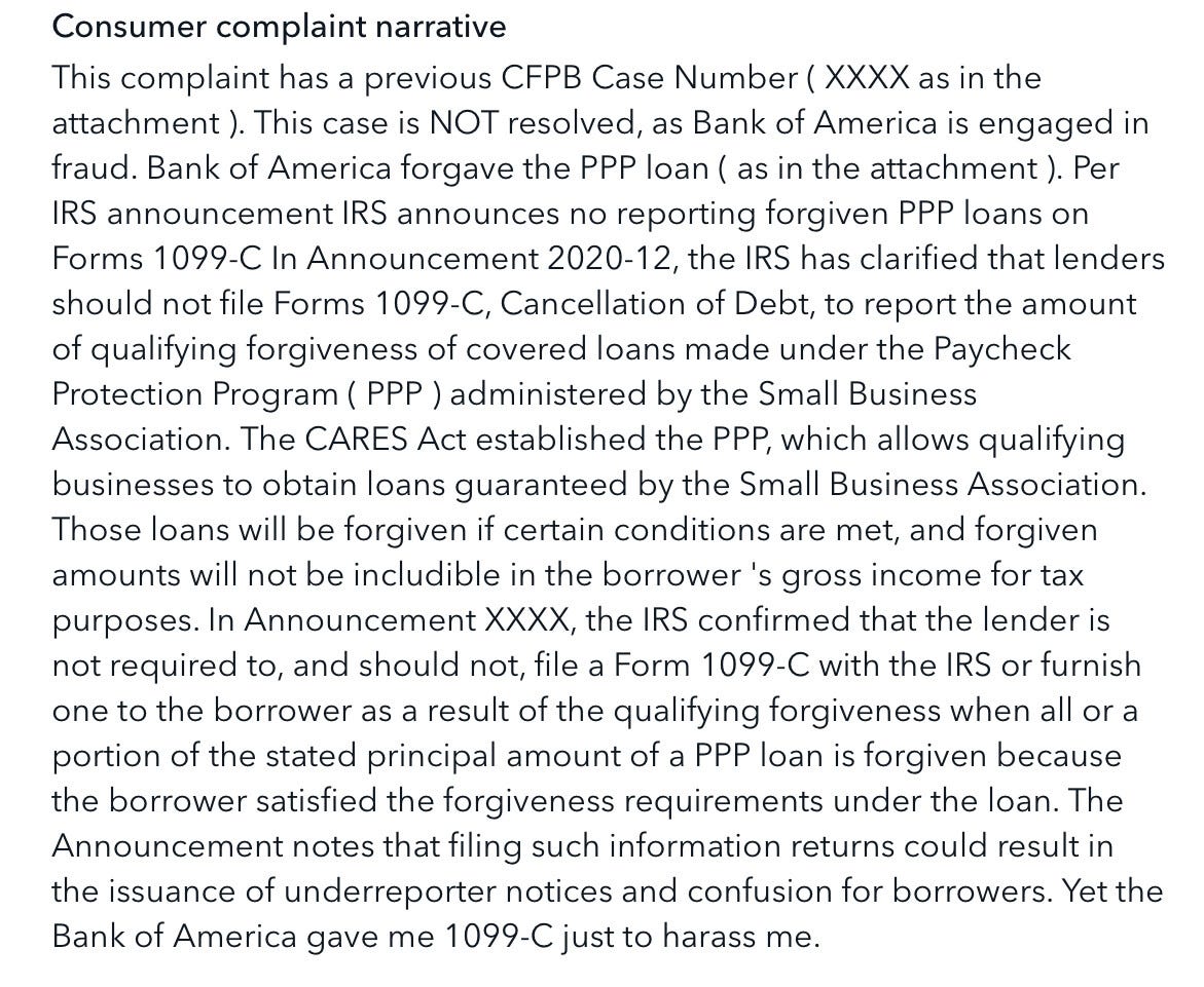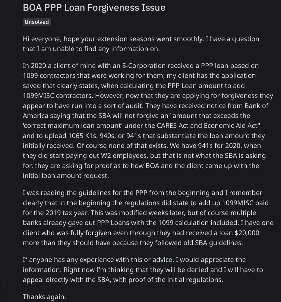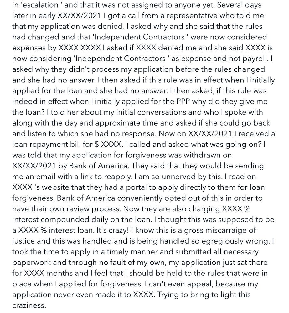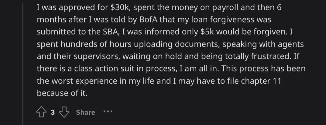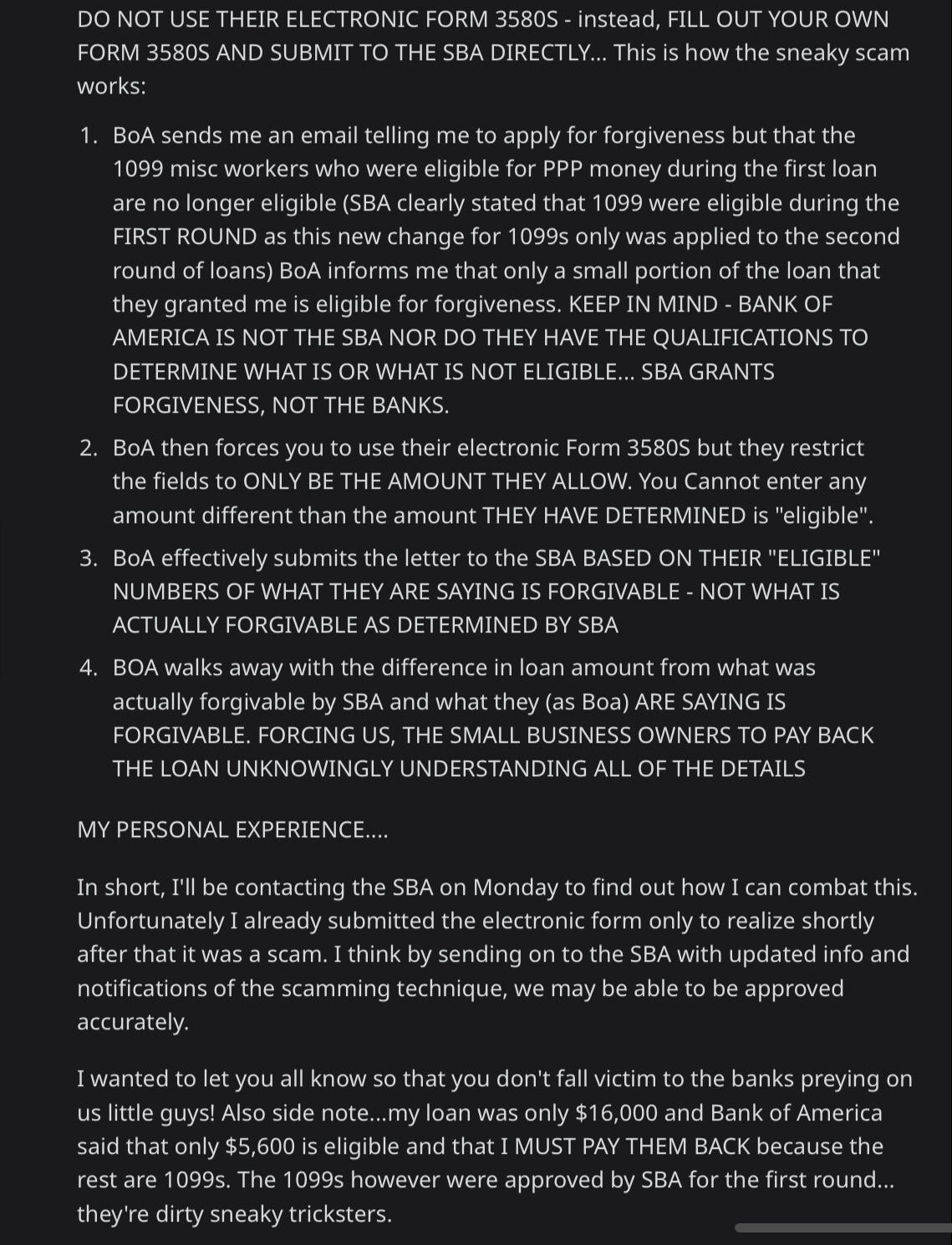 The last comment drives home the ultimate impact of what this handling may have done to some business owners. But how did BOA stand alone? Simply put, through the fact that they misrepresented the SBA guidance to their lenders around 1099 workers, stating explicitly in their guidance to business lenders that they could apply for loans that included payroll for 1099s. These complaints/experiences shared above are unique to BOA and have almost no corresponding versions tied to other institutions, large or small (we looked). You can get a better sense based on reading the above of the rude awakening these borrowers got when, months after getting loans from BOA, instead of having the full amount forgiven, they are hit back up to repay almost all of it.