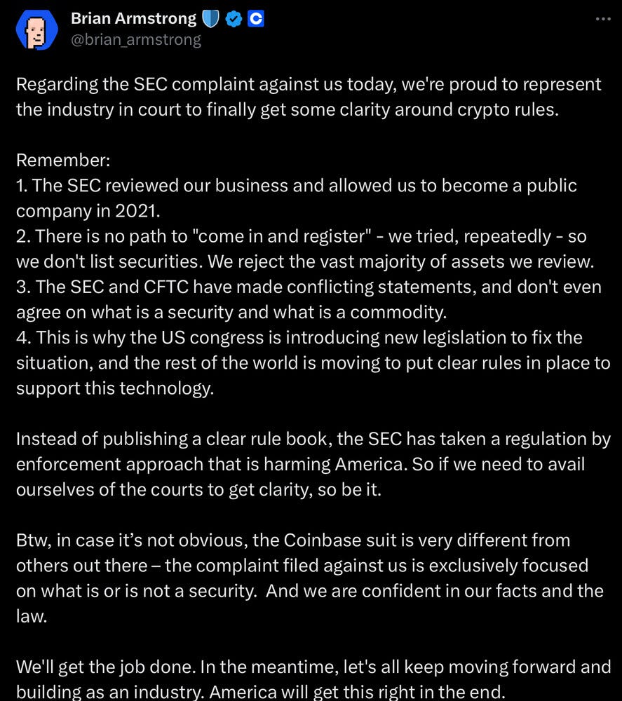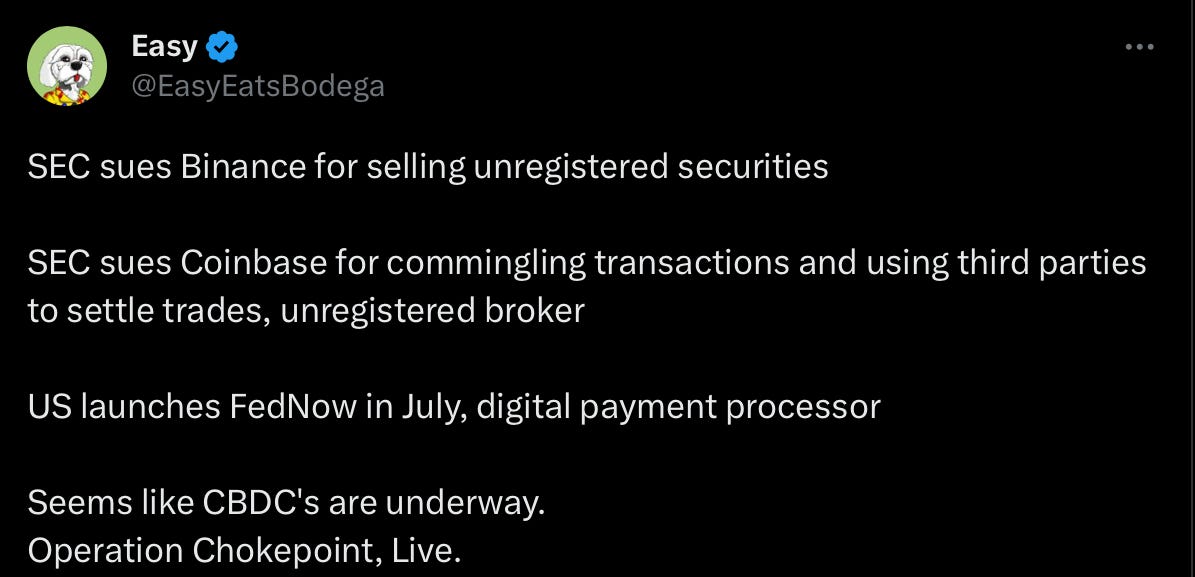 There isn’t really much else as juicy on the Coinbase end beyond the last bullet (as CEO Brian Armstrong will make sure you note based on the tweet shared above). Regardless, both cases will go to court and we’ll see how things develop. Does this mean the end of crypto in the US? Who knows - upon this case being filed, Robinhood (not mentioned, but probably worried they could be next) has since decided to delist three crypto tokens and Binance.us has stopped accepting US dollar deposits. Coinbase, meanwhile, stands firm refusing to delist anything.