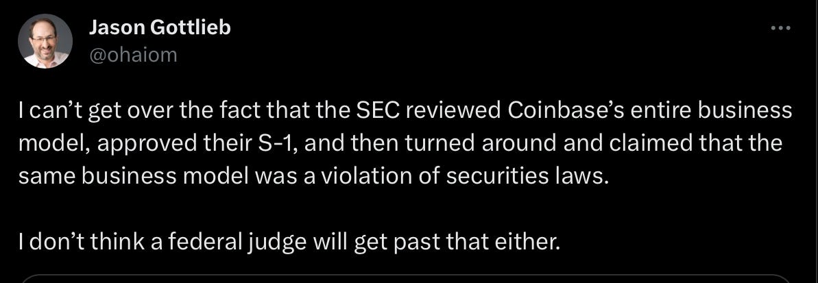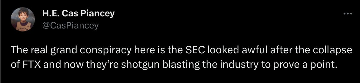 Putting aside the outrage, there’s a lot that Binance and Coinbase have done that is plain and simply not sustainable (Coinbase less so, as we’ll discuss later). However, the SEC is a tool of the federal government and like most regulators, has a stake in looking good and serving larger political agendas (not necessarily for one party or another).