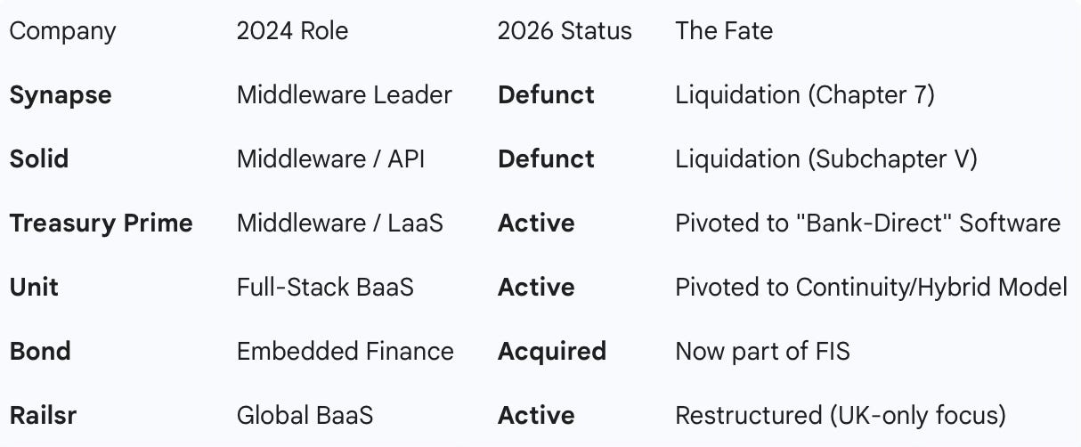 Analysis: Out of curiosity, I decided to take a look at what is left of the middleware space (specifically ledger as a service) that was a big thing in the BaaS space at the time this all started. I put together this table demonstrating what was happening in 2024 vs today in 2026: