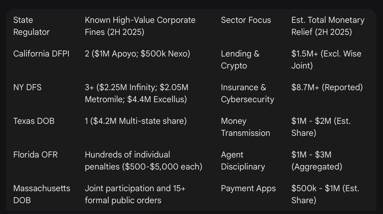 Analysis: Here’s a quick table that shows some of the key fines and penalties across some of the larger state regulators in 2H 2025: